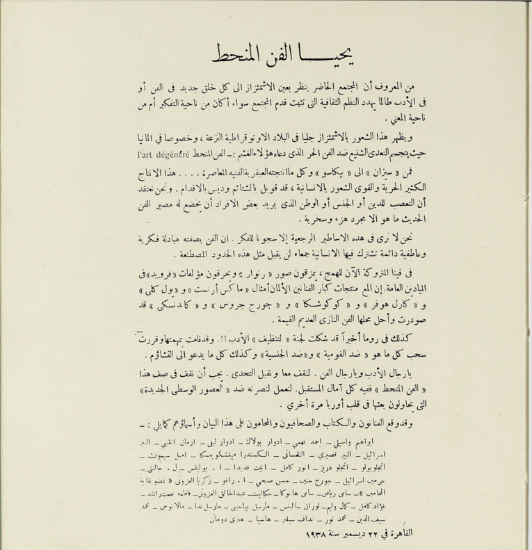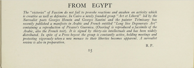 “انتصارات” الفاشية لا تفشل في إثارة ردود الفعل وتوقظ نشاطًا إبداعيًا ودفاعي. في القاهرة ، قامت مجموعة تم تأسيسها حديثًا بعنوان الفن والحرية بقيادة الشاعرين السرياليين جورج حنين وجورج سانتيني والرسام كامل التلمساني بنشر بيان رسمي باللغتين العربية والفرنسية بعنوان يحيا الفن المنحط ، والذي يحتوي على نسخة طبق الأصل من لوحة بيكاسو جيرنيكا. وقاموا يُنسخ نسخة من اللغة العربية ، وكذلك النص الفرنسي ، وقد تم توقيعها من قبل ستة وثلاثين مثقفًا ، وتم توزيعها على نطاق واسع ، وعلى الرغم من مقاطعة الصحافة ، فإن المجموعة تنشط باستمرار ، حيث تعقد اجتماعات ويزداد احتجاجهم بقوة عندما يكون هناك تهديد جديد موجه إلى حرياتهم ، والمراجعة السريالية هي أيضا قيد الإعداد. )