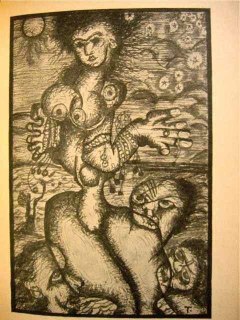 Prior to signing the manifesto “Long Live the Degenerate Art”, Henein and Kamel Telmisany collaborated in producing Déraisons d’être, a collection of poems written by Henein and illustrated by Kamel, published in November 1938. The poems and drawings set the tone against classicism and academism in literature and arts, the same way the group’s manifesto stands against crawling Nazi discourses in Europe and among Egyptian elites. Telmisany’s artwork and writings, I argue, constitute a virulent critique of modernity’s celebration of reason especially with its nasty implications on colonized nations and populations. Modernization did not mean for him a rational tabula rasa of traditional bonds, feelings, customs and beliefs; to the contrary, modernization was not the main target, nor was Reason the main drive of his artistic and theoretic production. Democratization of freedom and independence (two values that seemed to be the propriety of Modern Western powers) were best exemplified by the slogans published in La Part du Sable, in 1947: 1) The individual against the tyranny of the state; 2) The imagination against the routine of dialectical materialism; and 3) Liberty against all forms of terror.