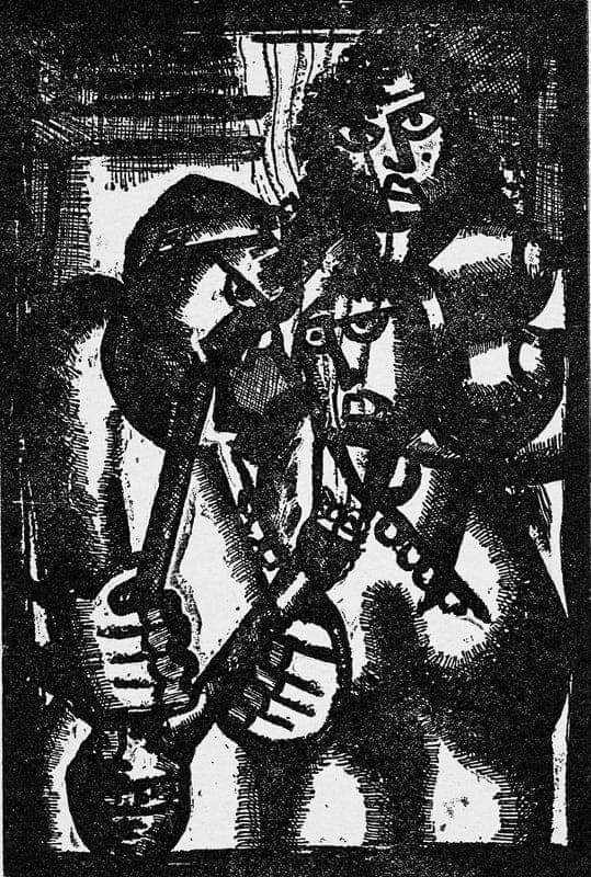 One cannot help but remember connections with, and reminiscences of, famous cubist figures (such as Picasso’s Weeping Woman) and German expressionist drawings and cinema (such as Karl Schmidt-Rottluff’s deconstructed bodies and Wiene’s Dr. Caligary’s horror cult). Yet despite this obviously intertextual dialogue, Telmisany’s figures, especially in the drawings and lithographs, are gloomier: they are haunted, distressed, haggard, rusty biblical nails and huge crosses stop or burden their movement, no salvation in poverty and suffering; rupture and violence surround their dislocated bodies and fractured skulls. Figures are built in brick, yet they attempt to break free from this oppressive monumentality; they do so through the gaze, through gazes in a state of becoming-multiplicity, facing destruction and despair with poise, or with a hint of resentment. The hands are also expressive and bear a multiplicity of connotations; one can see another hint to German expressionism in cinema (see Wiene’s The Cabinet of Dr. Caligar, 1920 and The Hands of Orlac, 1924 as well of Murnau’s Nosferatu, 1922) as hands in Telmisany’s drawings obviously bring the attention back on human destructiveness and refocus the viewer’s gaze on immanent repulsiveness rather than on metaphysical salvation or punishment.