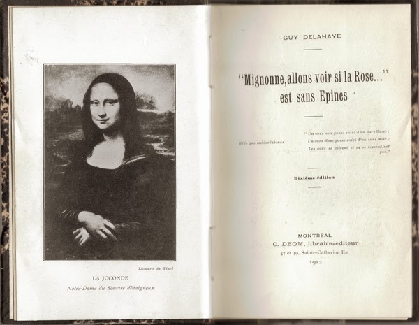 Guy Delahaye pratique abondamment le collage d’éléments littéraires et artistiques. En fait, tout Mignonne est composé ainsi. À commencer par le titre, détournement d’un vers de Pierre de Ronsard. Sept ans avant LHOOQ, de Marcel Duchamp, Delahaye appose une légende énigmatique sous une reproduction photographique de la Joconde: « Notre-Dame du Sourire dédaigneux ».
