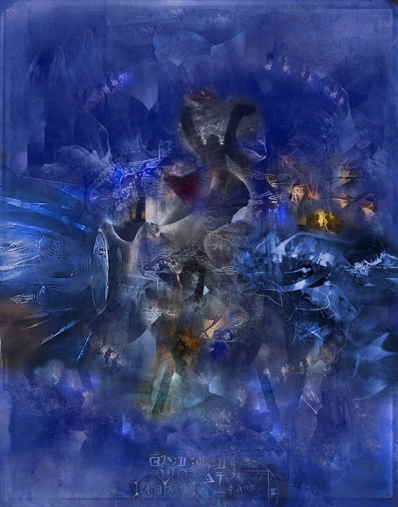 In that space between you and the mirror, a slowly rotating constellation of unnatural design. Your reflection ignited. You see only yourself, or another time sequence… You see through, and for a few brief moments, you die, without waiting. You cannot remember that first momentous gesture… There is an image of it in chiaroscuro… A map of the city underneath, glazed over with a wealth of interruptions… In blue chalk.