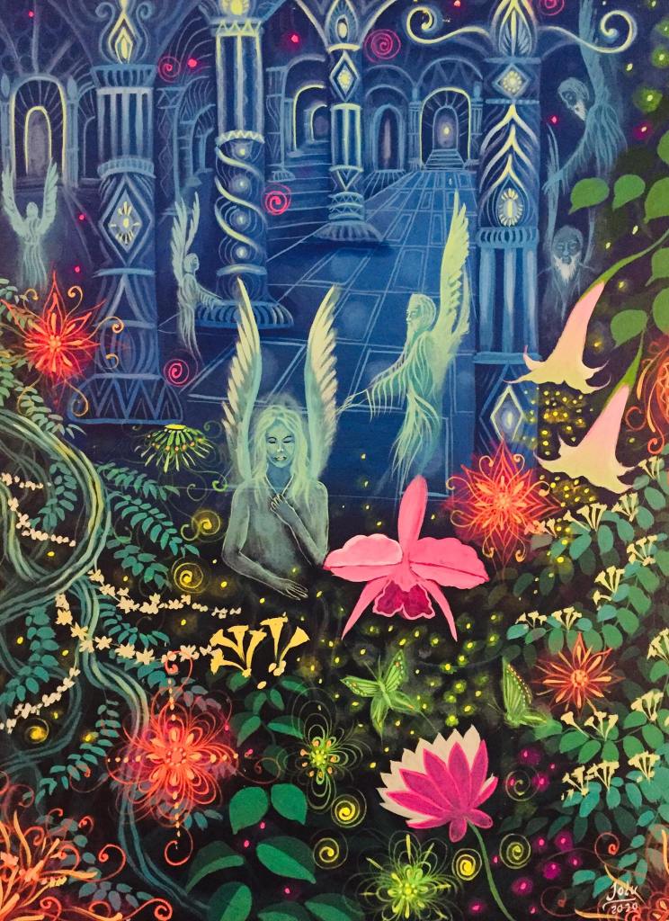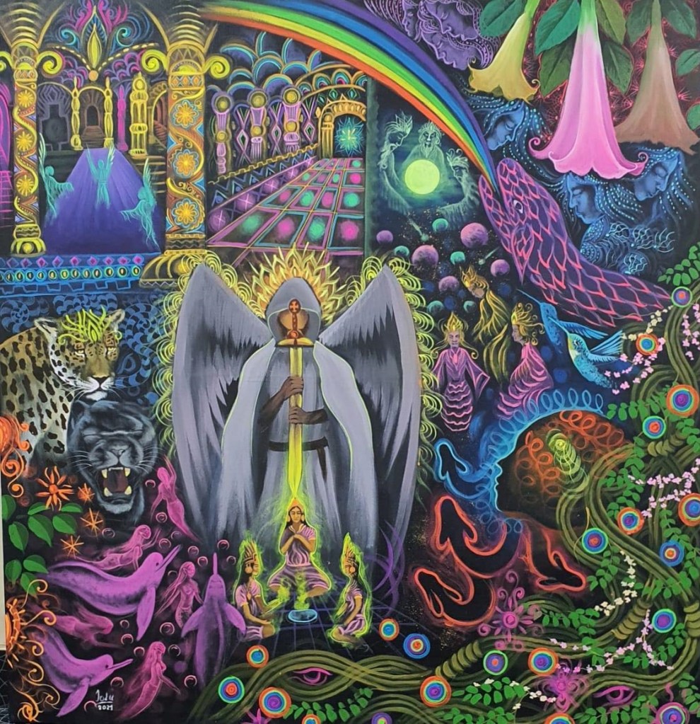 At 6 years of age, I began to transfer my inspiration and imagination to paper using tempera paint, with the guidance and teaching of my grandfather Pablo Amaringo, over the years I learned to use the technique of acrylic painting on canvas. Today I paint in acrylic and oil, the visions of ayahuasca and neo Amazonico styles, all thanks to my dear grandfather Pablo Amaringo Shuña.