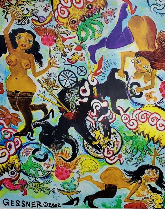 A Gessner painting is both a spontaneous explosion of unified discordant imagery and a well planned composition. Playful and serious. Lusty and graceful. A rutting splendor with poise. A prankster-voyeur fingerprint. Hungry for tricks but satiated. Universal and timeless. Accessible but remote. A dance and a meditation. A party and a wound. Disciplined but irreverently free.