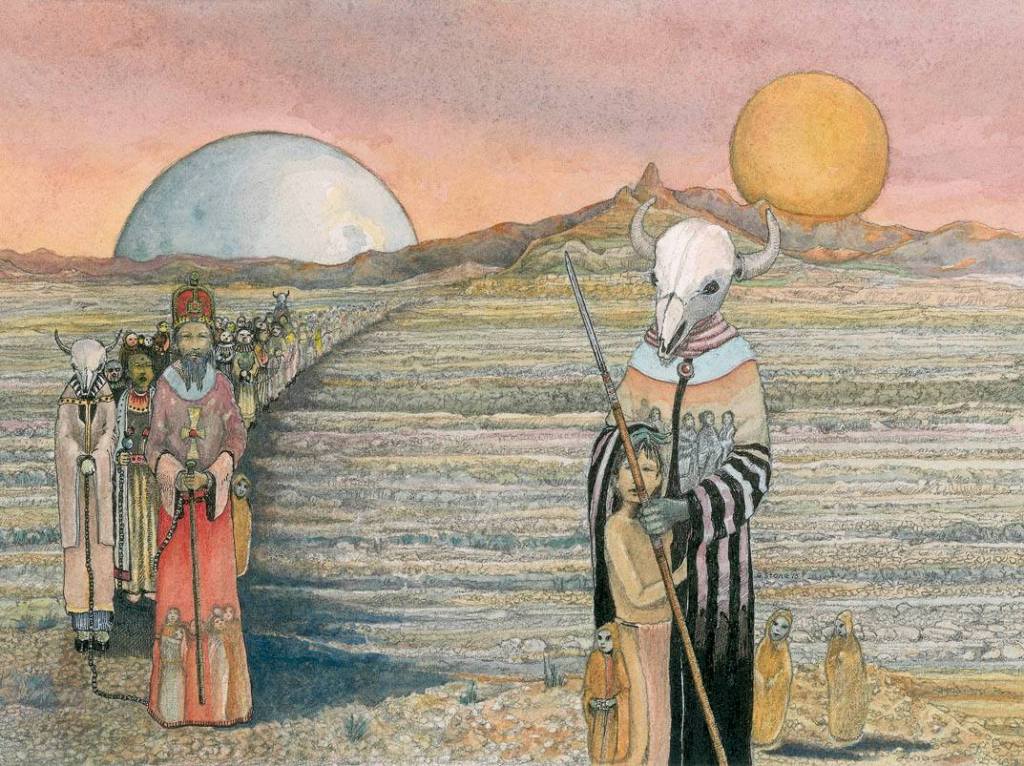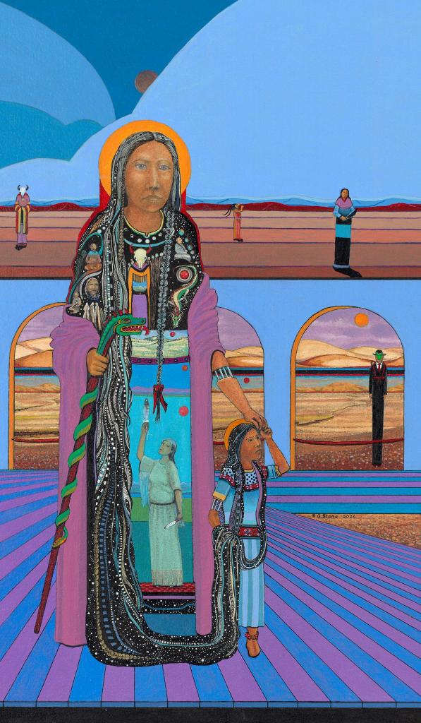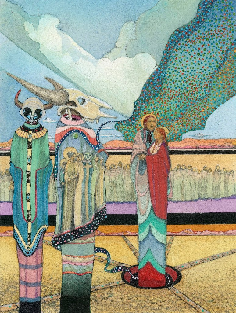 From a show at the Crocker Museum in Sacramento a write-up describes Gerald Stone as a “beloved local master artist”. Gerald himself just brushed off the accolades and calls his work “weird”. His stylized art, which he describes as a conversation between himself and his Creator, bridges traditional and contemporary styles and themes.