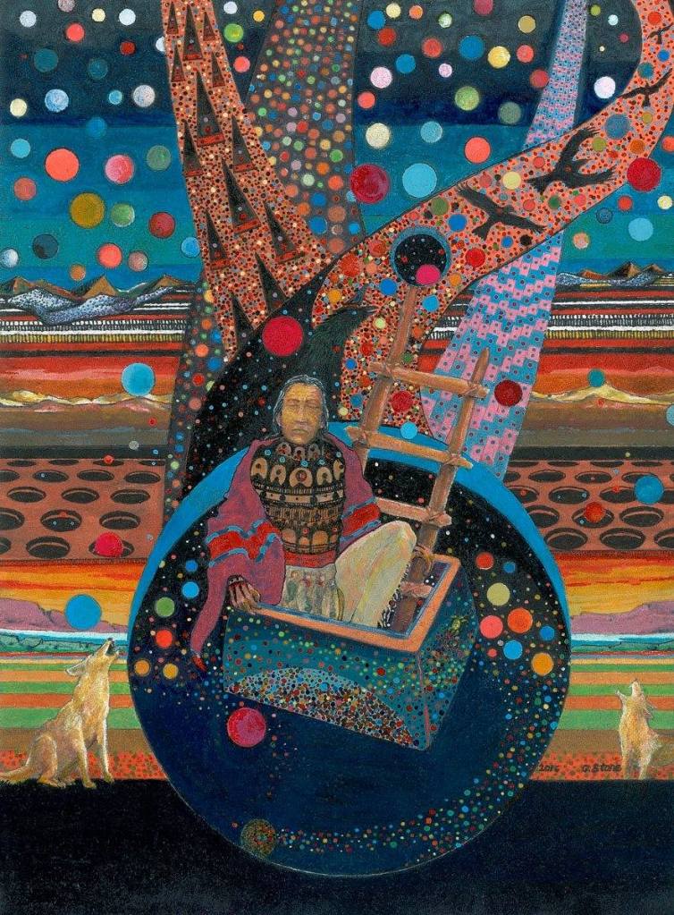 1947 Born in the far reaches of rural Oklahoma, Stone was a kid who liked to draw and has lived a life of peaks and valleys, always around the midline of art. Just 3 days before he was scheduled to enlist in the Army, headed most likely to Vietnam, he was accepted for a 2 year post graduated program at the Institute of American Indian Arts (IAIA) in Santa Fe, a city often considered the center of the Native American art world.