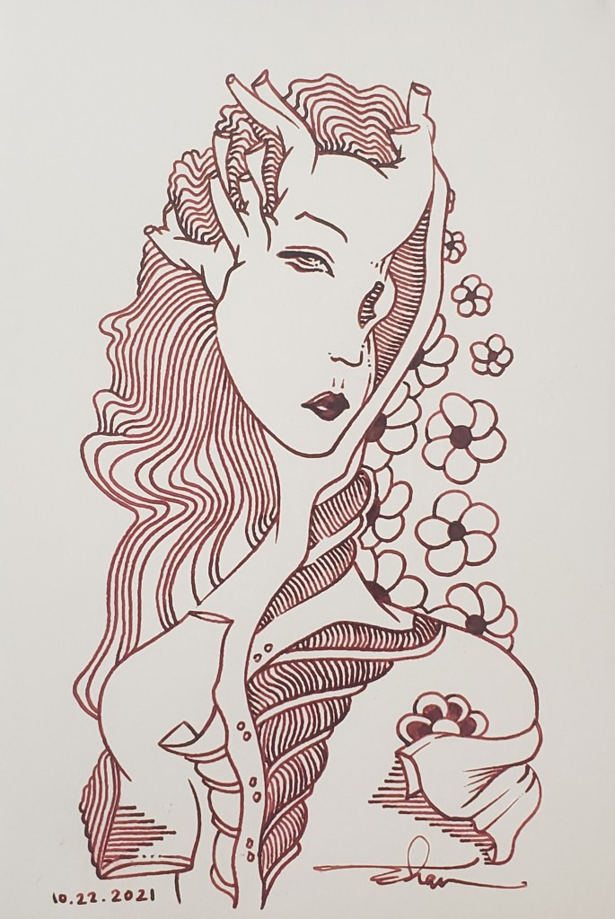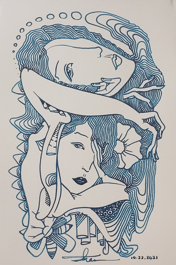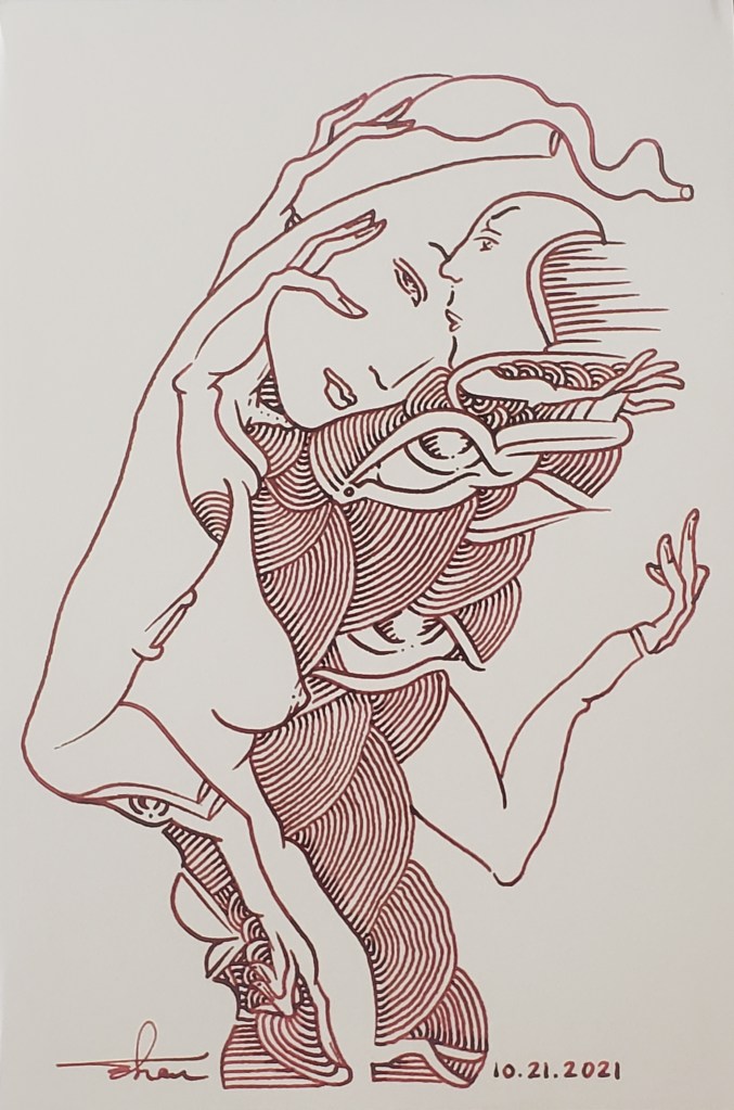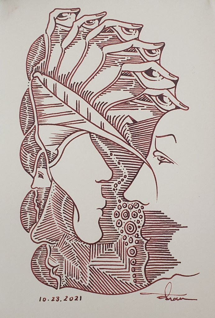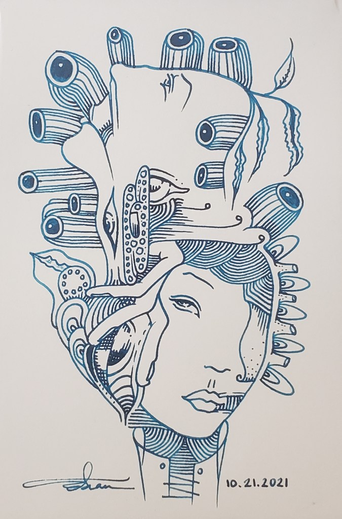 This current Prussian/Mahogany ink series is a study in how color transmits context in relationship to mood. The deep range of the blue when used in fountain pen format allows the ink to pool in places where I allow the line to end.