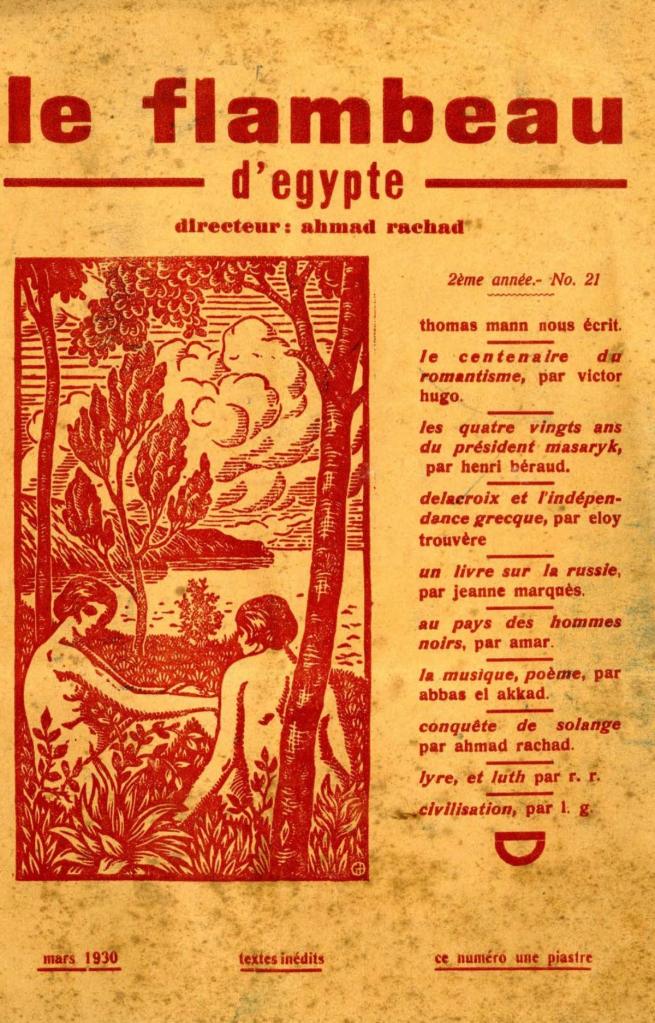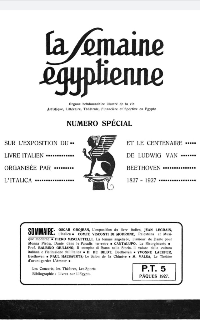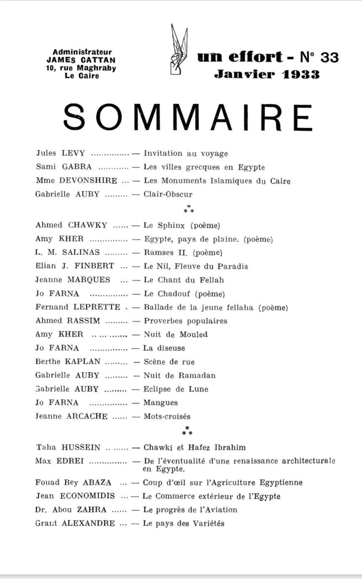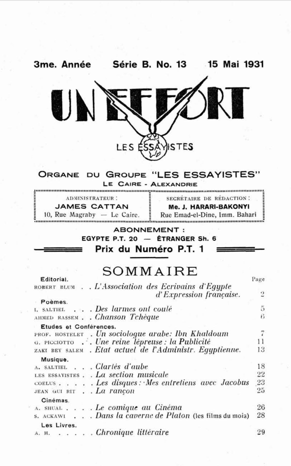 وبدأت تدور النقاشات على صفحات المجلة حول الشرق وعلاقته بالغرب أولاً من خلال الخلاف حول الموسيقى ، ثم امتدت النقاشات تدريجياً إلى أشكال فنية أخرى ، ولا سيما إلى الأدب. ثم أعلنت المجلة عن تأسيس جمعية كتاب مصر للتعبير الفرنسي ، والتي ترحب بالأعضاء وكتب روبرت بلوم عن الجمعية