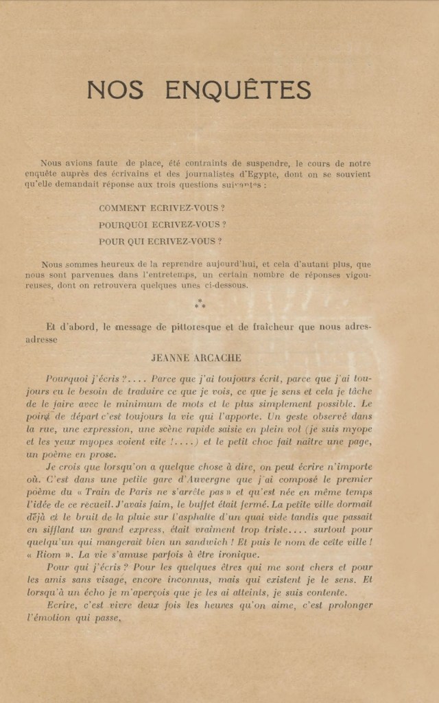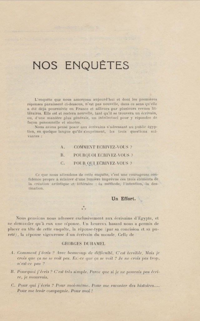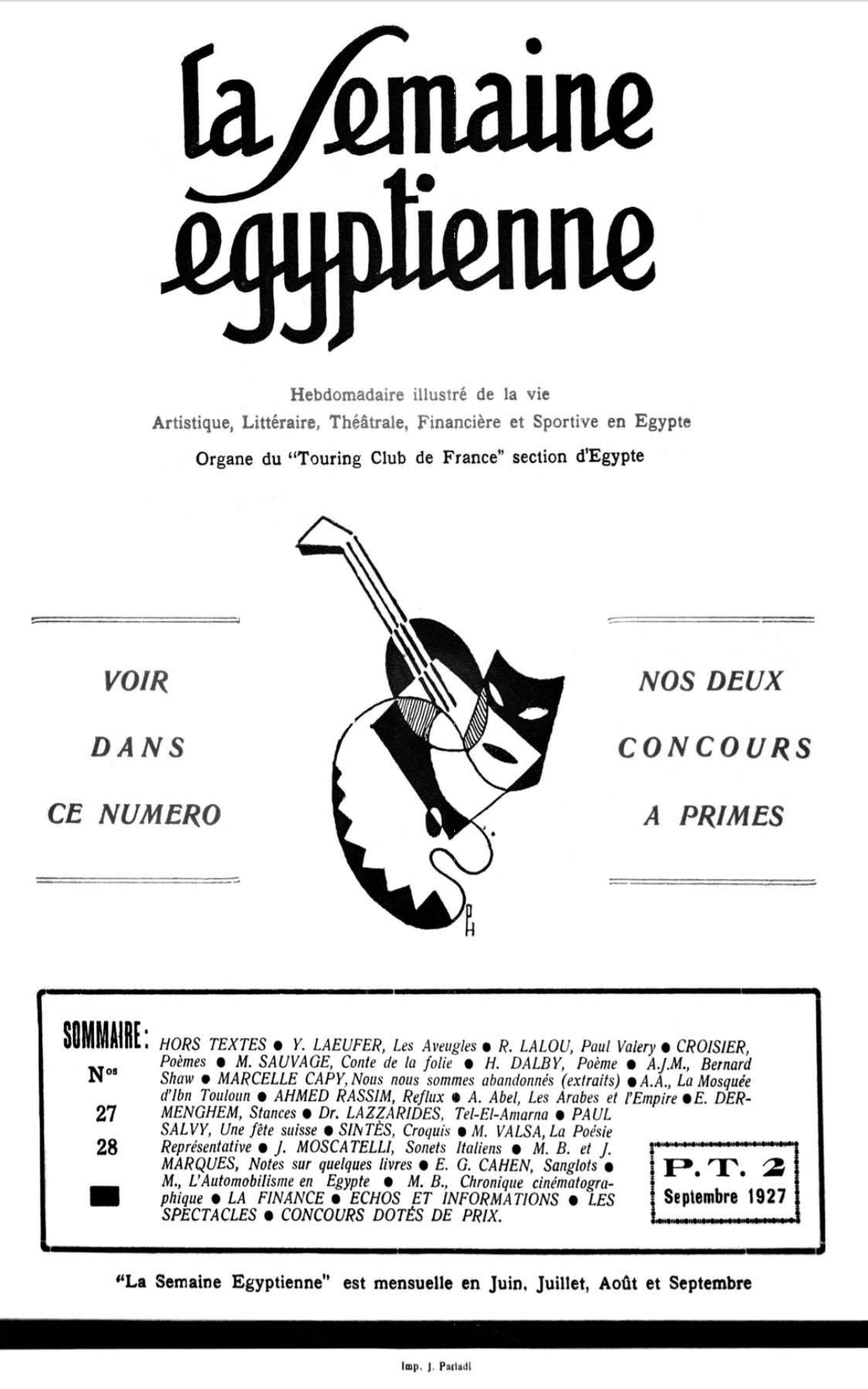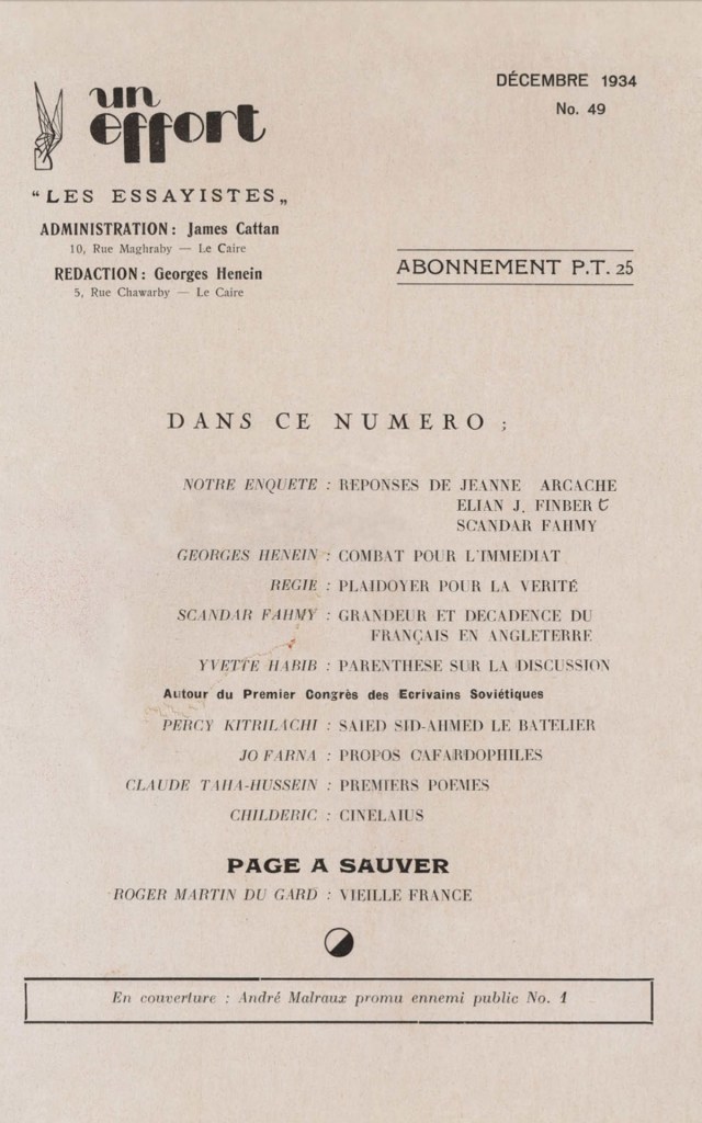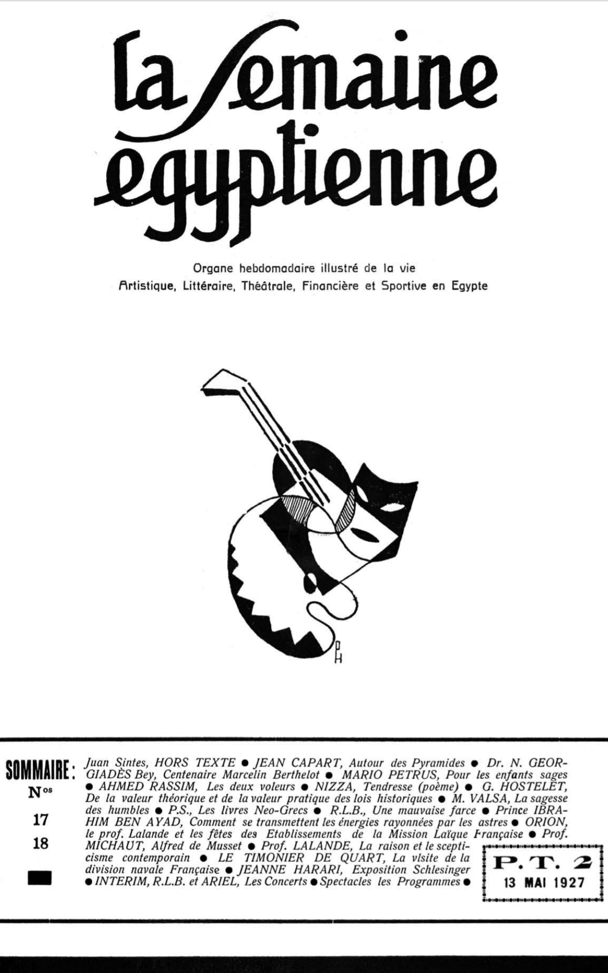 وبدأت تدور النقاشات على صفحات المجلة حول الشرق وعلاقته بالغرب أولاً من خلال الخلاف حول الموسيقى ، ثم امتدت النقاشات تدريجياً إلى أشكال فنية أخرى ، ولا سيما إلى الأدب. ثم أعلنت المجلة عن تأسيس جمعية كتاب مصر للتعبير الفرنسي ، والتي ترحب بالأعضاء وكتب روبرت بلوم عن الجمعية