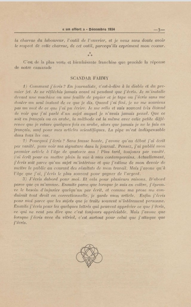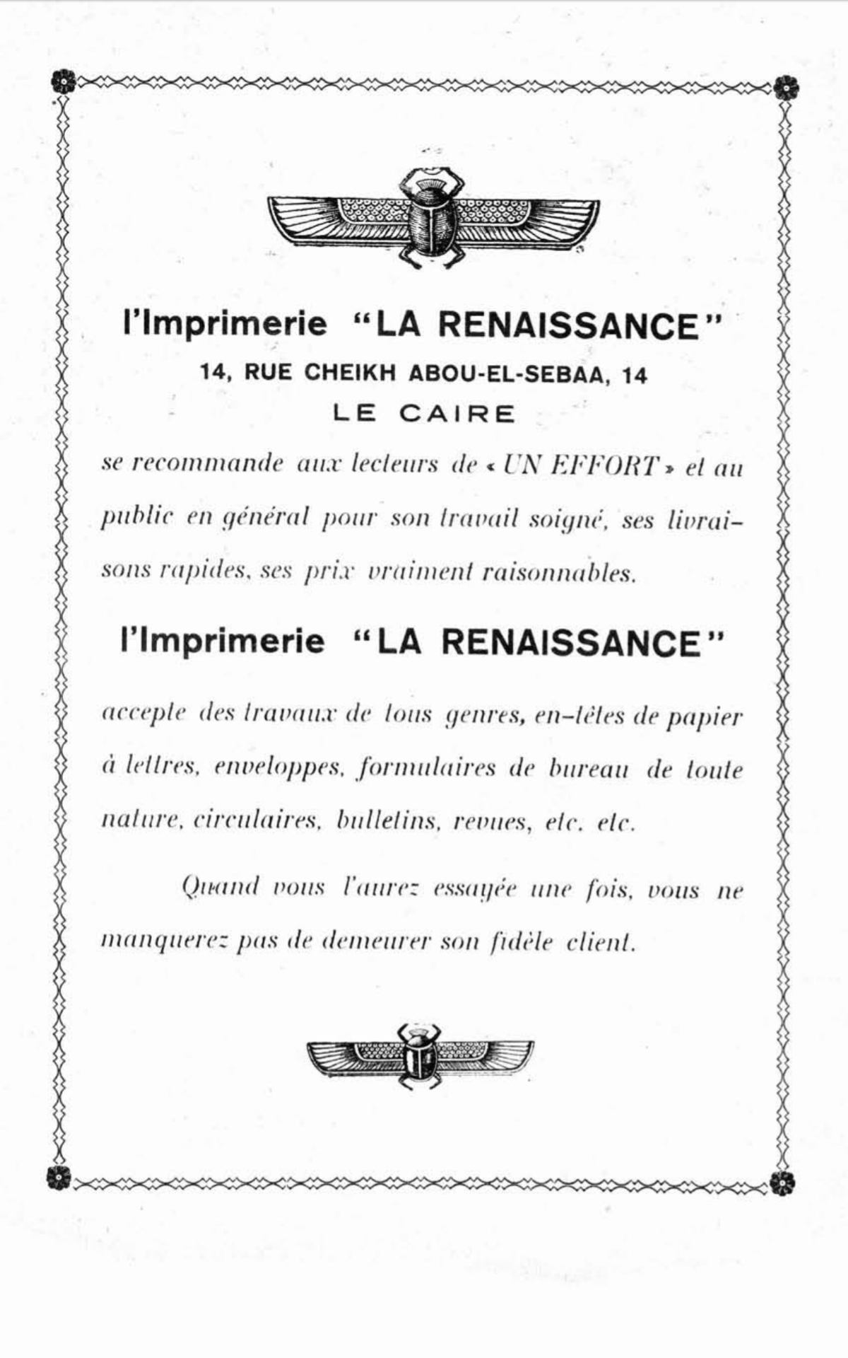 («سيتم تبادل الأفكار ، ستجري المناقشات ، سيولد النور الذي يجب أن يسمح بظهور المواهب وتهدف الجمعية إلى إعطاء صورة أجنبية أكثر فأكثر لمصر فما هو على المحك هنا هو “صورة مصر” في الخارج ، رابطة كتاب مصر للتعبير الفرنسي تدعي صورة “حقيقية” ، وبالتالي تعارض الصورة الخيالية أو التخيلية التي بناها الغرب )