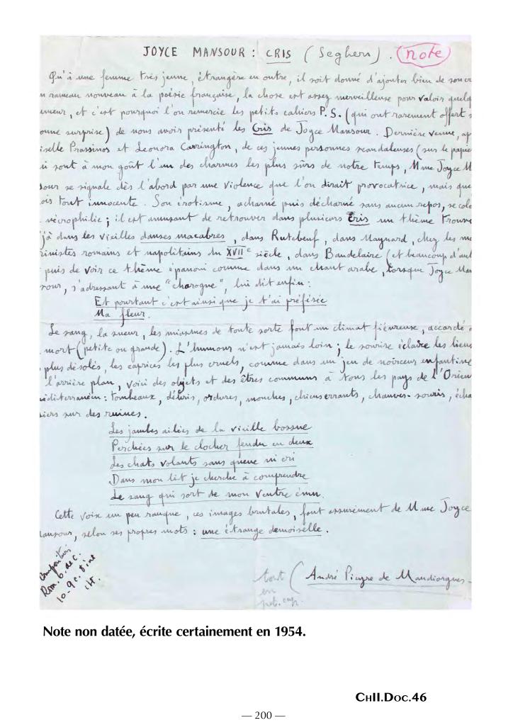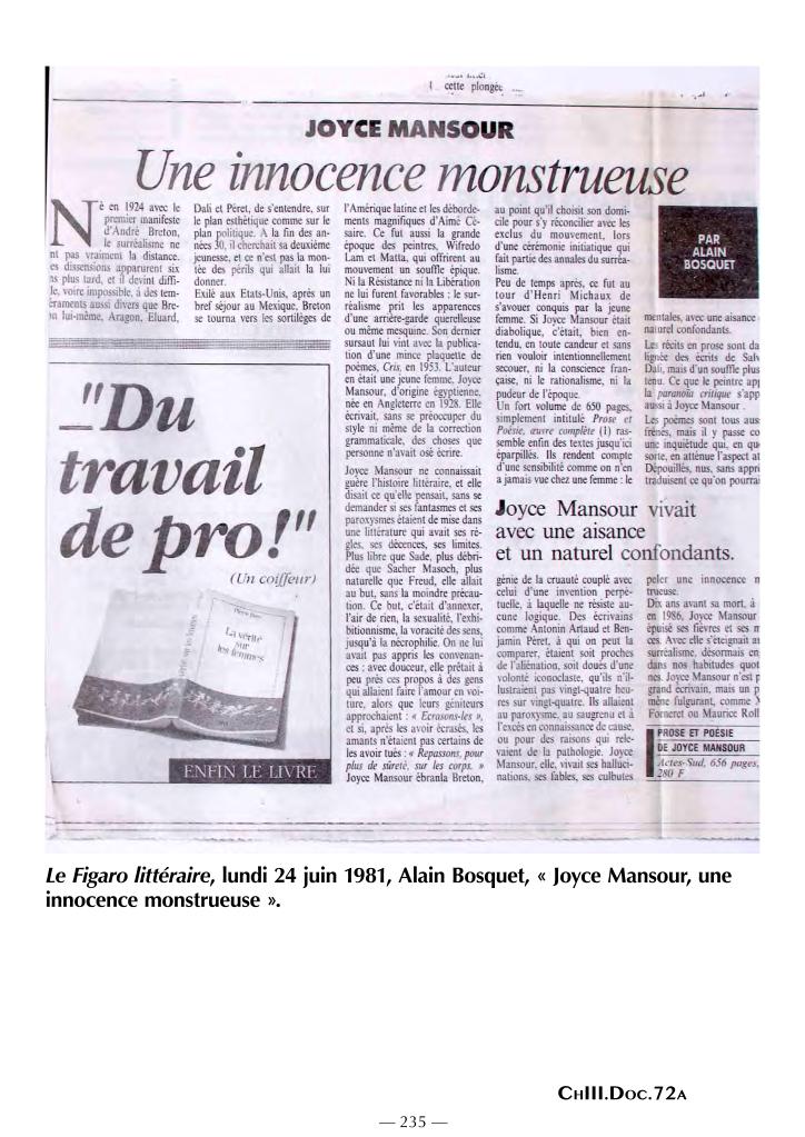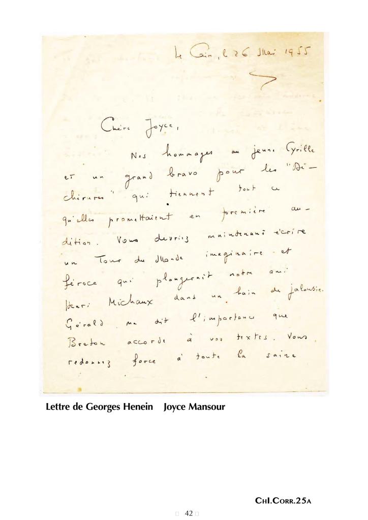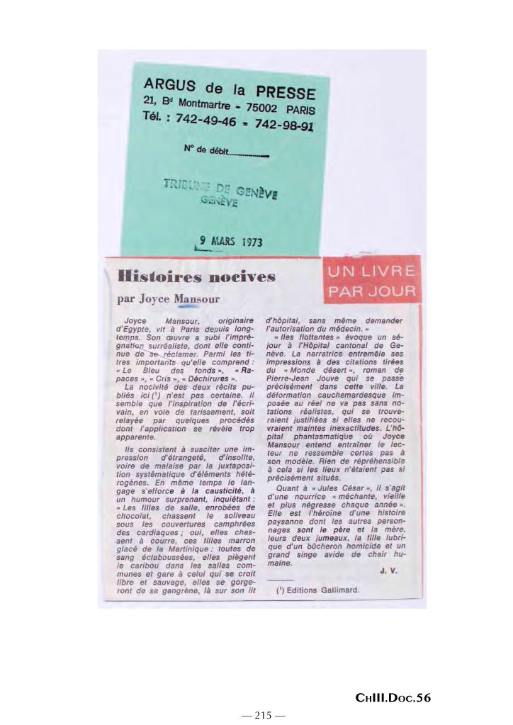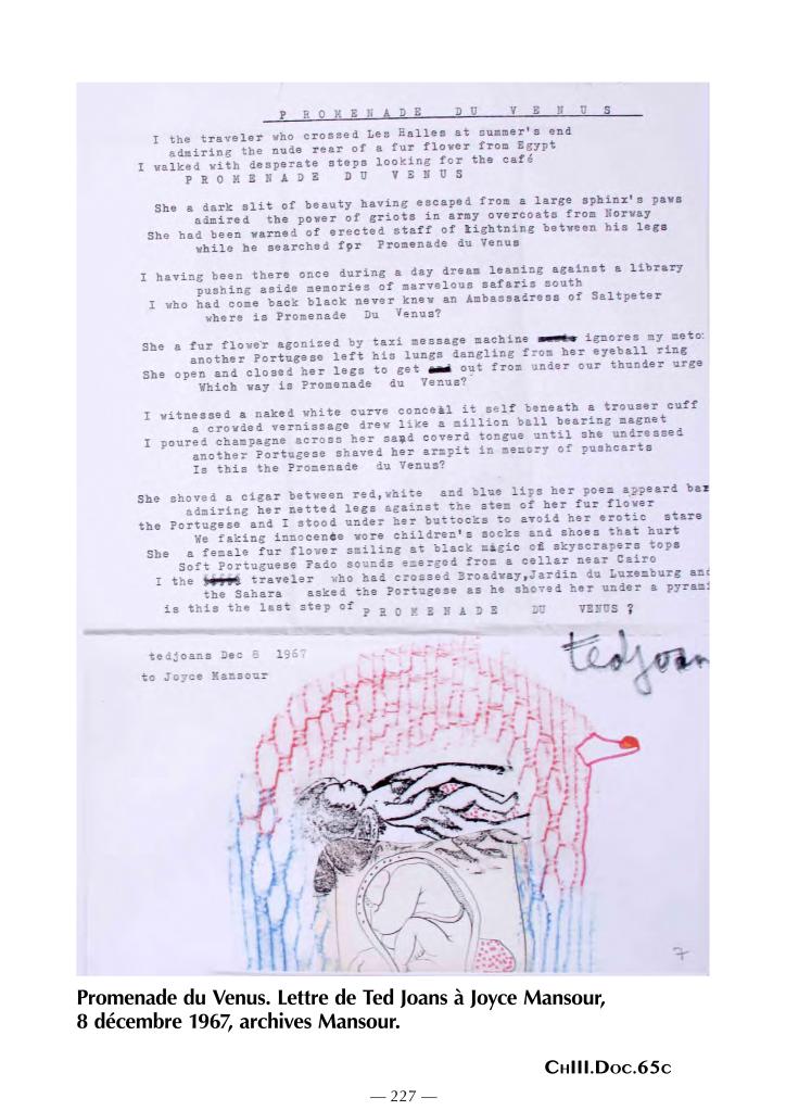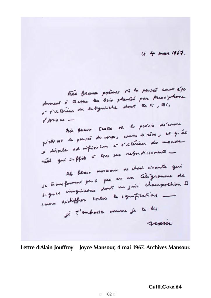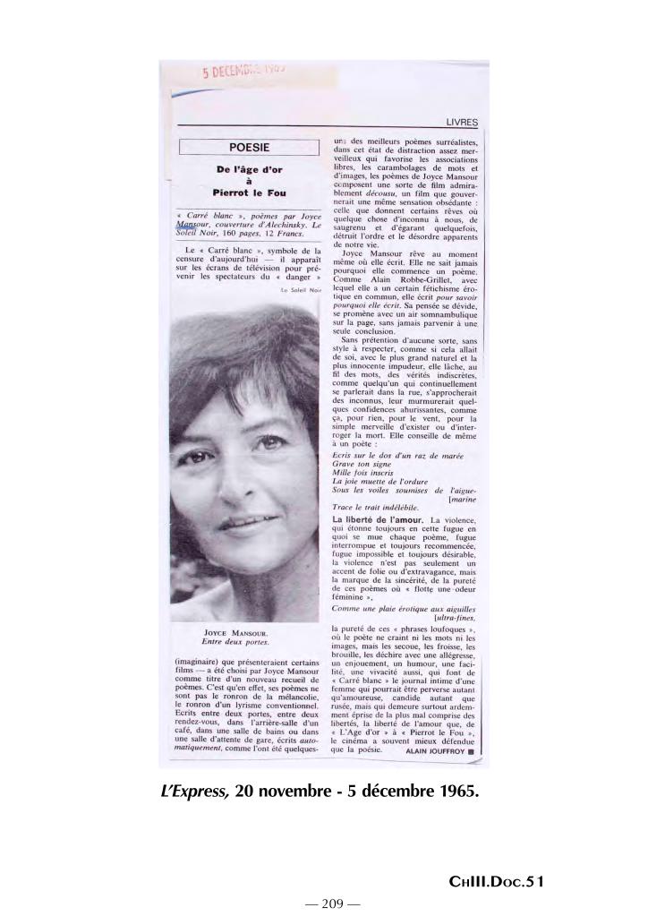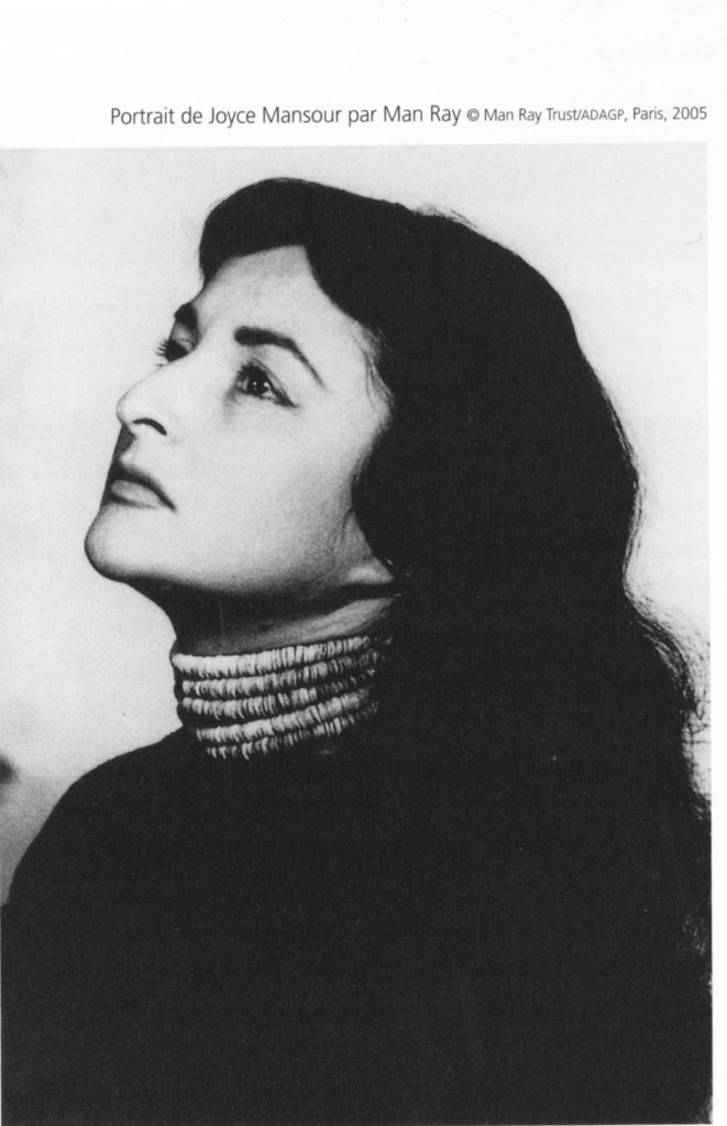 Joyce Mansour is a poet whose metaphorical images emerge from her private subconscious. She sometimes invokes ancient Egypt, its myths, and death together in the context of dramatic and violent confrontations with all suppressors of desire. She seeks death and at the same time seeks to kill it.
