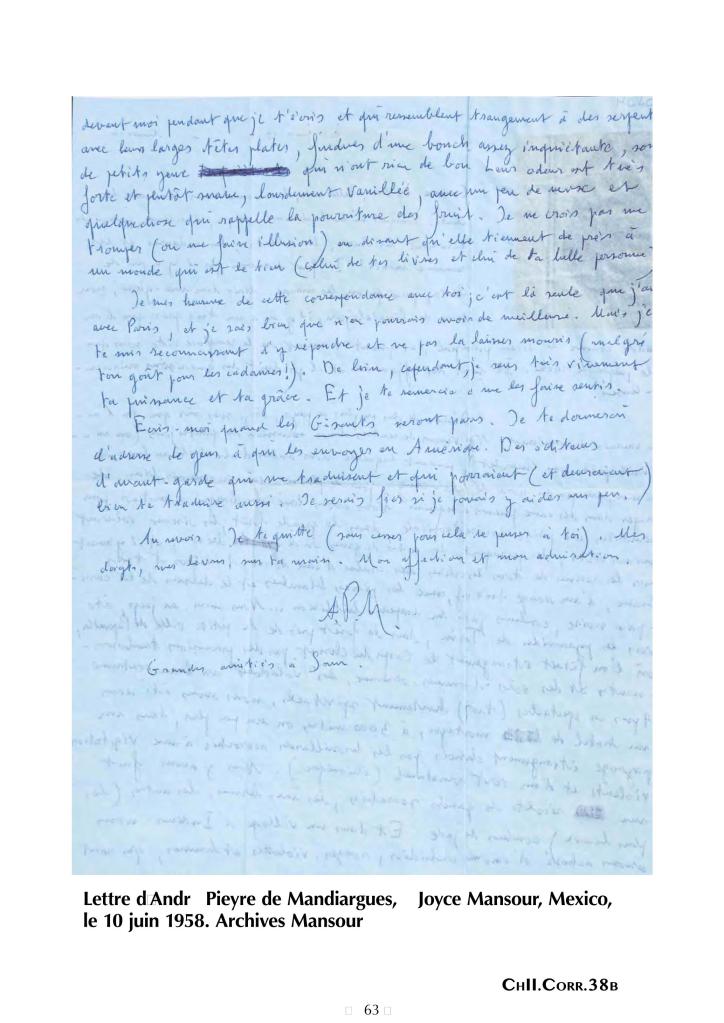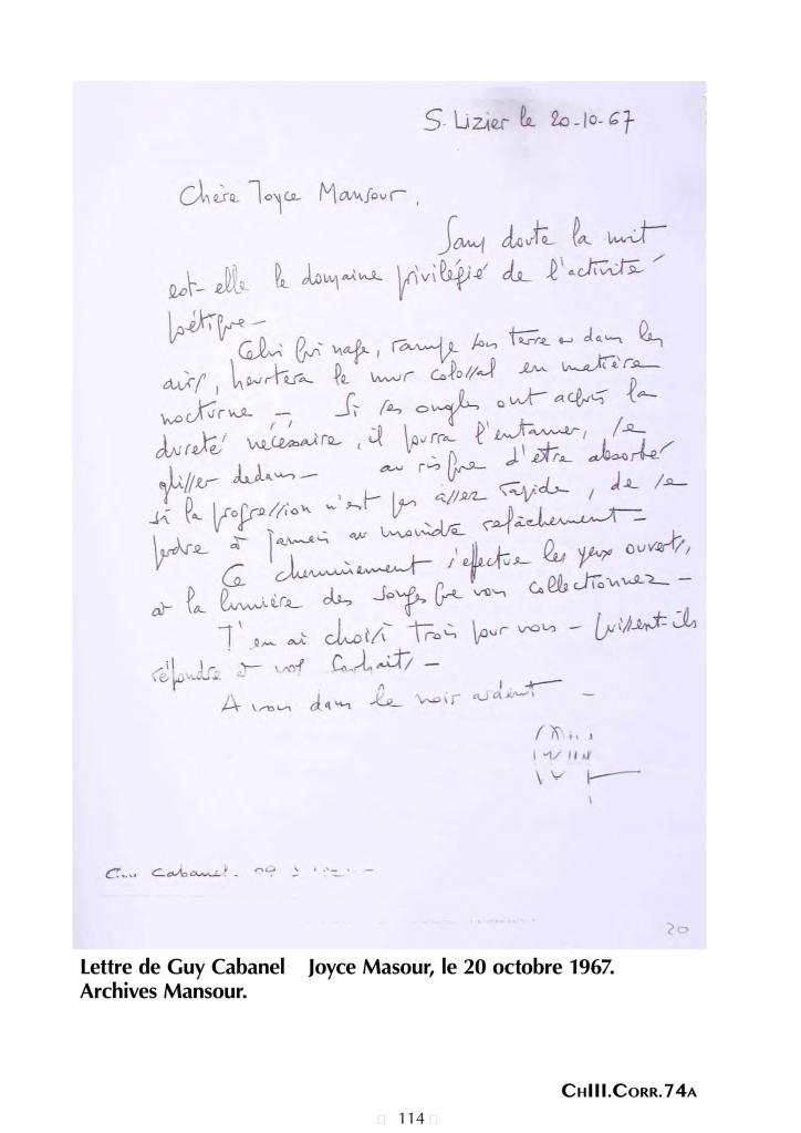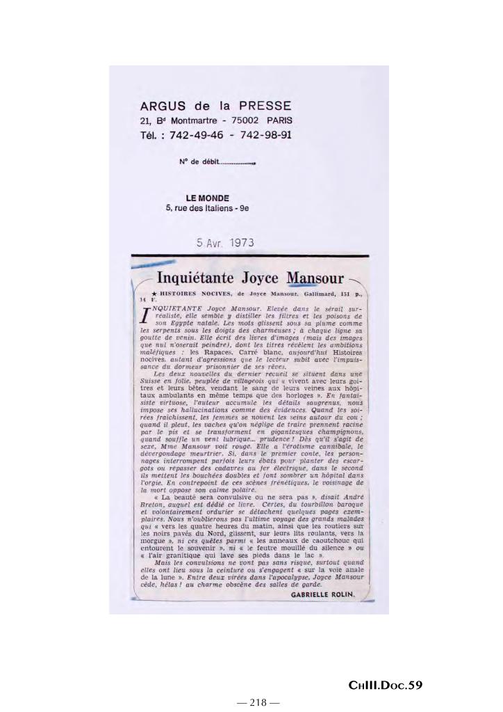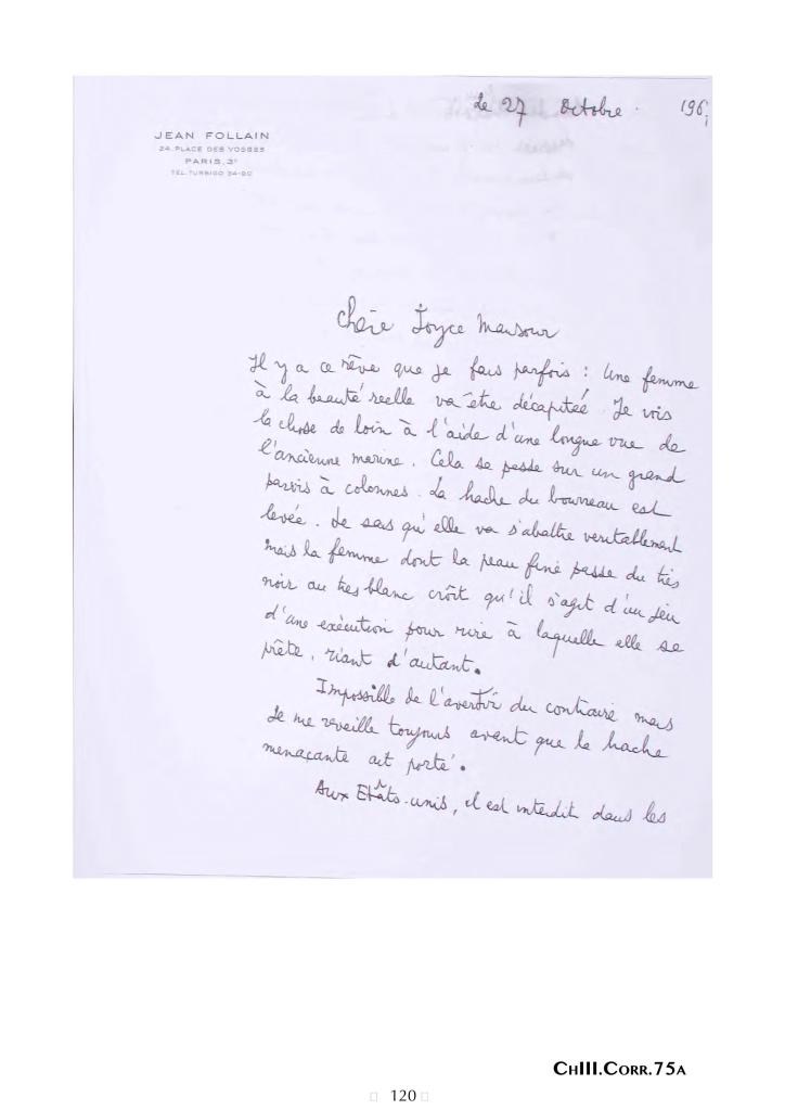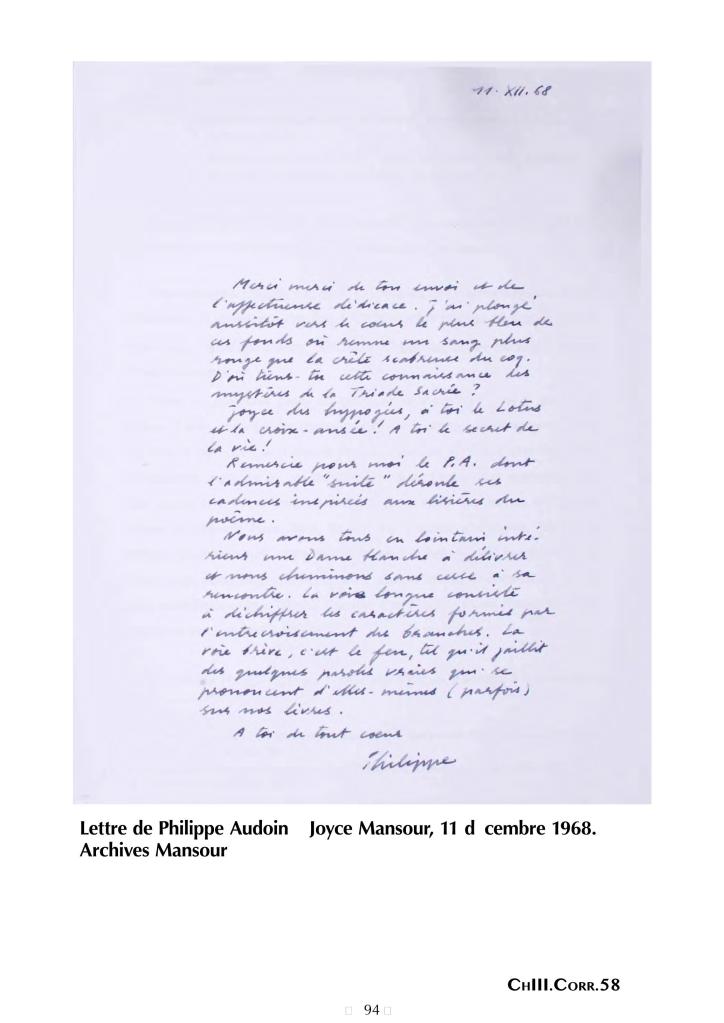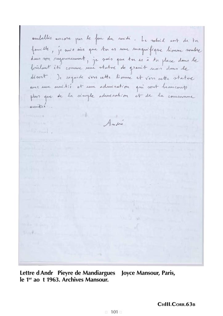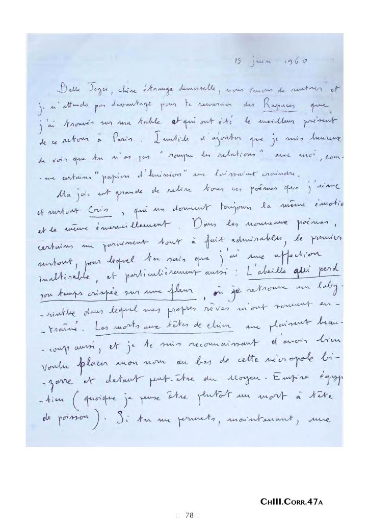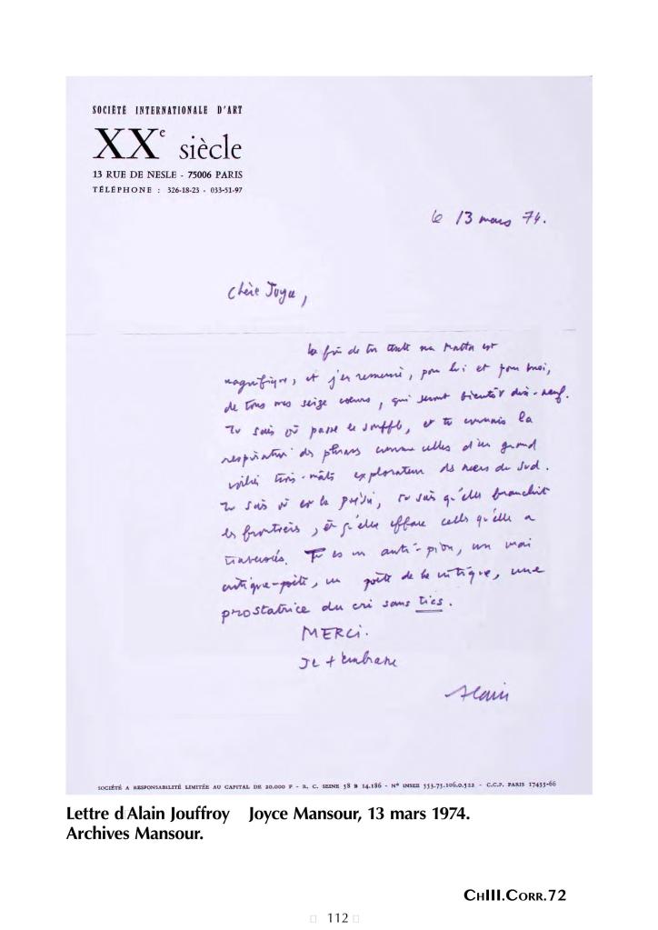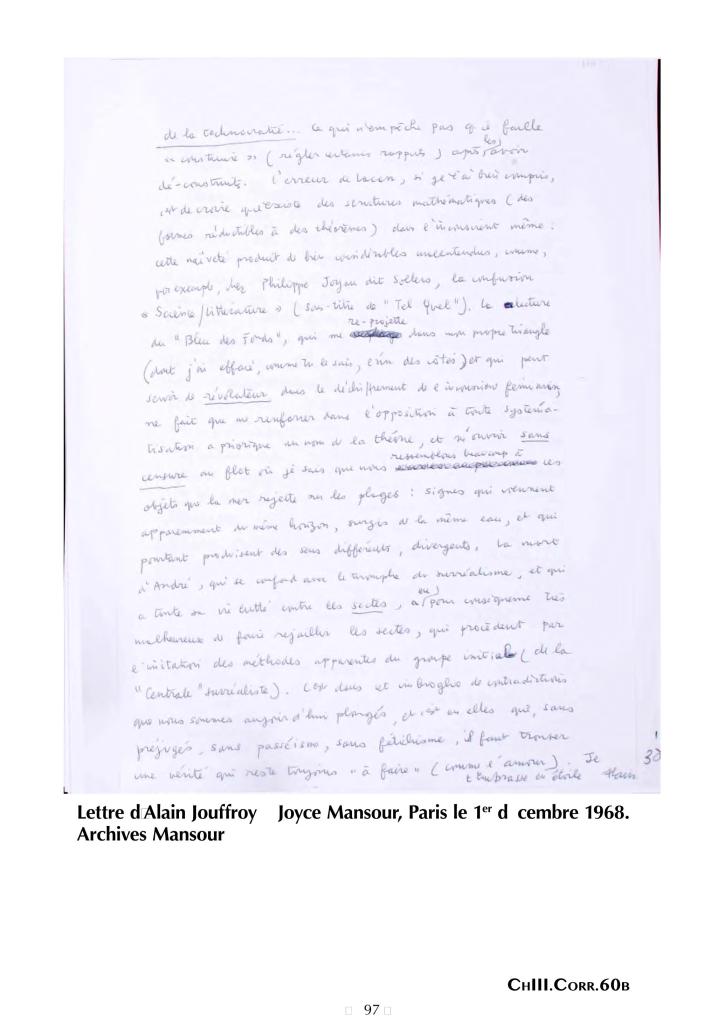 Joyce Mansour is a poet whose metaphorical images emerge from her private subconscious. She sometimes invokes ancient Egypt, its myths, and death together in the context of dramatic and violent confrontations with all suppressors of desire. She seeks death and at the same time seeks to kill it.