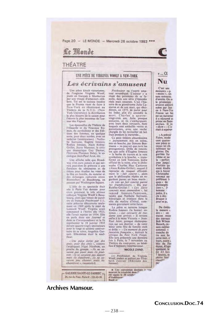 The universe evoked in Joyce Mansour’s writings is a world in which there is no God. This explains the absence of the idea of feeling sinful. She grew up in an environment in Cairo, where religion was not talked about, where words like redemption and sacrifice had no meaning. Therefore, she uses language devoid of any religion . In this process of exorcism of metaphysics, writing is inherent in freedom, the freedom to copy what extends on the other side of the boundaries of the rational thinking . Far from thinking about the external world, Joyce Mansour devotes herself to examining her inner state. She transforms her everyday and familiar world into something “unexpected,” “unimaginable.” Joyce Mansour’s poetic fury is the engine of this transformation.