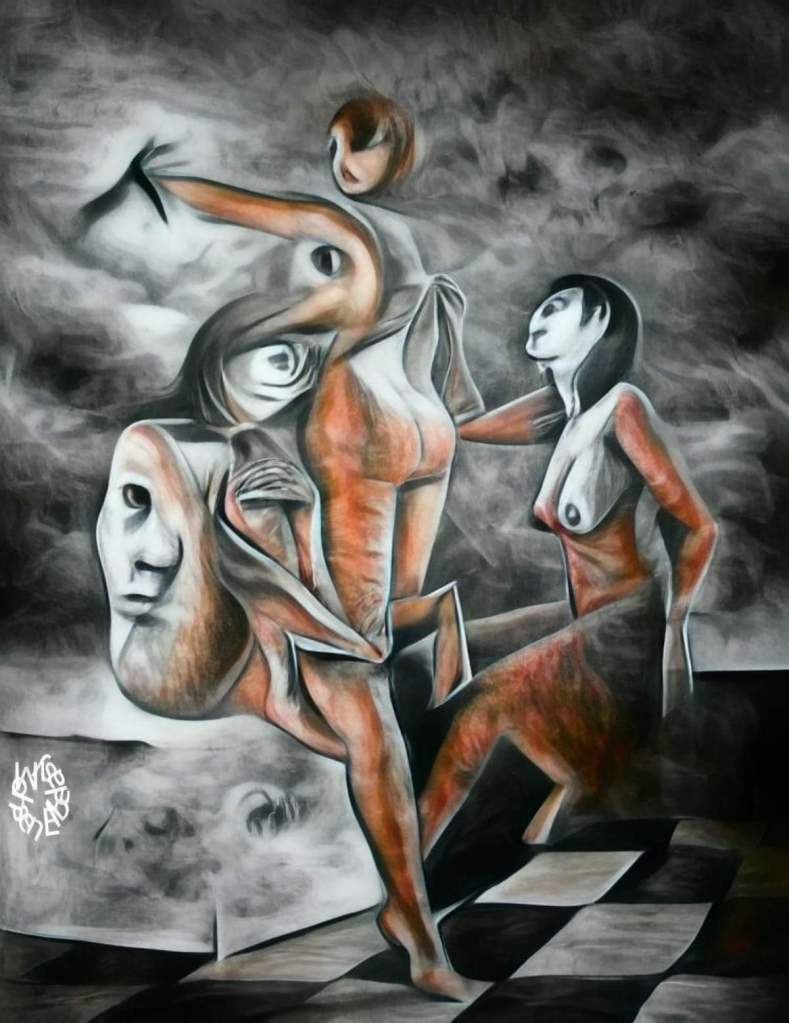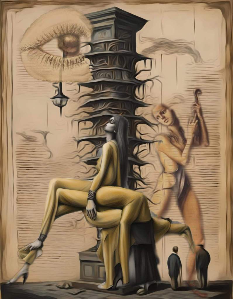 Her missing head ached with a pressure not born of flesh. Was she the only one untouched by the surrealism, or was there something deeper here? Like a keyhole glimpsed beneath layers of peeling wall paint, she felt an impossible truth just beyond her reach, a truth that might reside in the space her head should be.