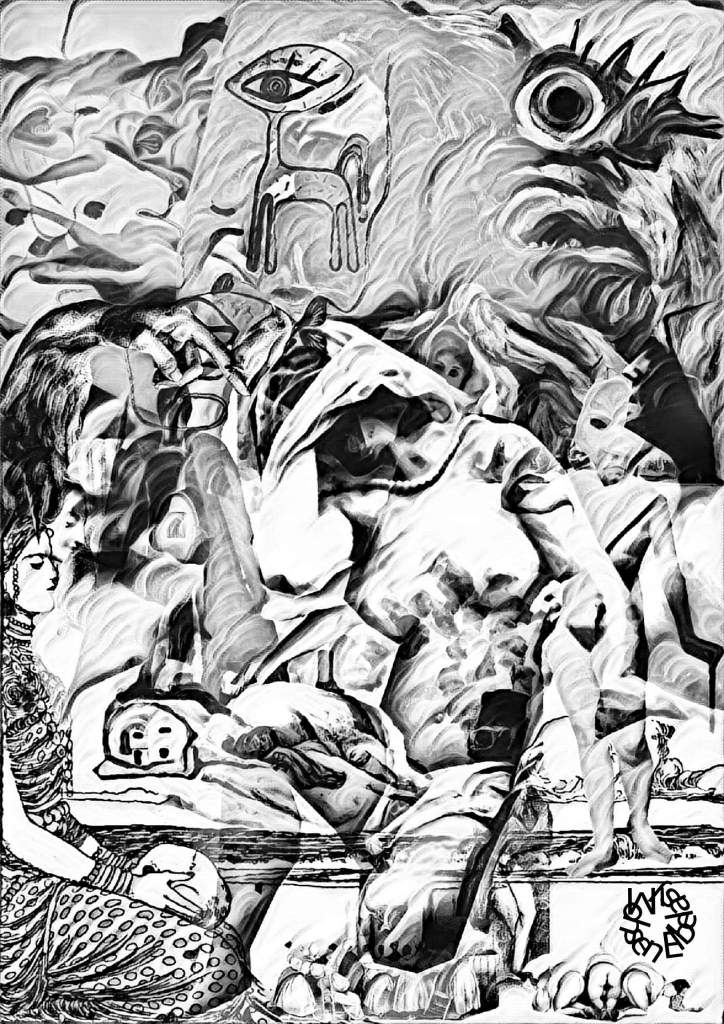 Blood sausage moon drips, howling wolves gnaw at its fleshy craters. The pavement erupts, spewing forth typewriters vomiting gibberish sonnets, metronomes marking the heartbeat of a broken clock. The severed hand of a mannequin tap dances on a newspaper headline: “PRESIDENT ABOLISHES GRAVITY.”