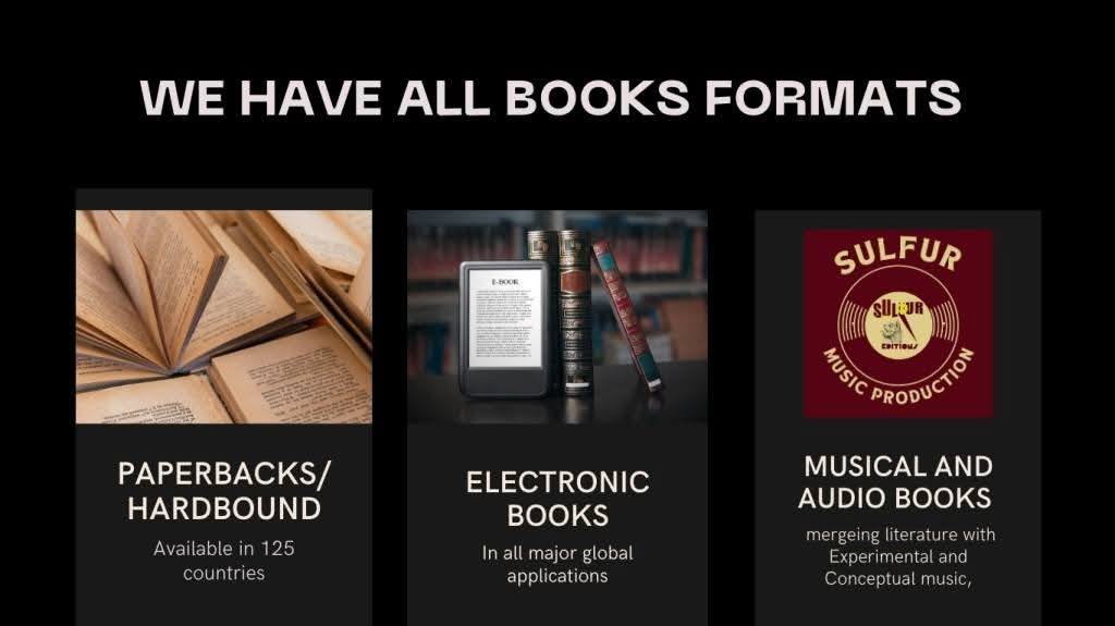 -Sulfur Music Production specialize in: -Producing independent hybrid experimental music: Pushing the boundaries of sound with innovative fusions of electronic, acoustic, and avant-garde surrealist styles. Championing sound/poetry art: Exploring the multifaceted world of sound art, from immersive installations to abstract sonic landscapes. -Merging literature and music: Weaving together the power of words and sound, collaborating with poets, writers, and spoken word artists to create unique and evocative sonic experiences. -Empowering outsider artists: Providing a platform for visionary artists from diverse backgrounds to share their unique voices and creative expressions. Sulfur Music Production will present a new paradigm in artistic expression, seamlessly blending music, literature, poetry, and modern visual arts to create truly immersive and unforgettable experiences.