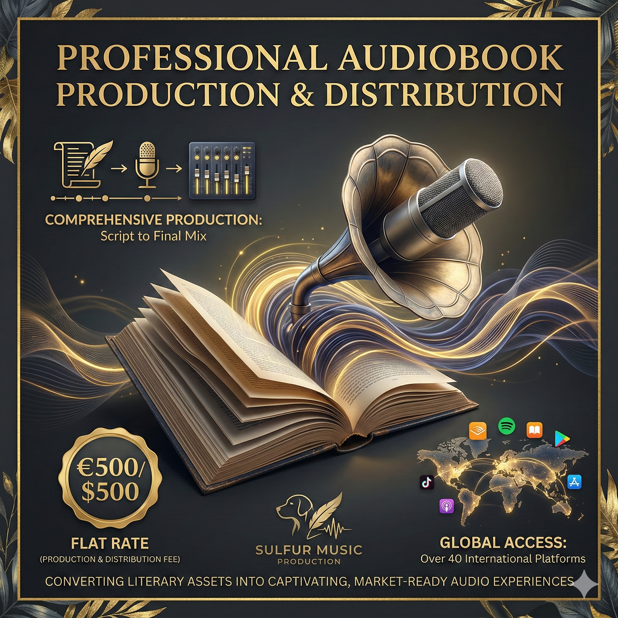 Through Sulfur Music Production, we offer a specialized service to convert your literary assets into captivating, market-ready audio experiences.
