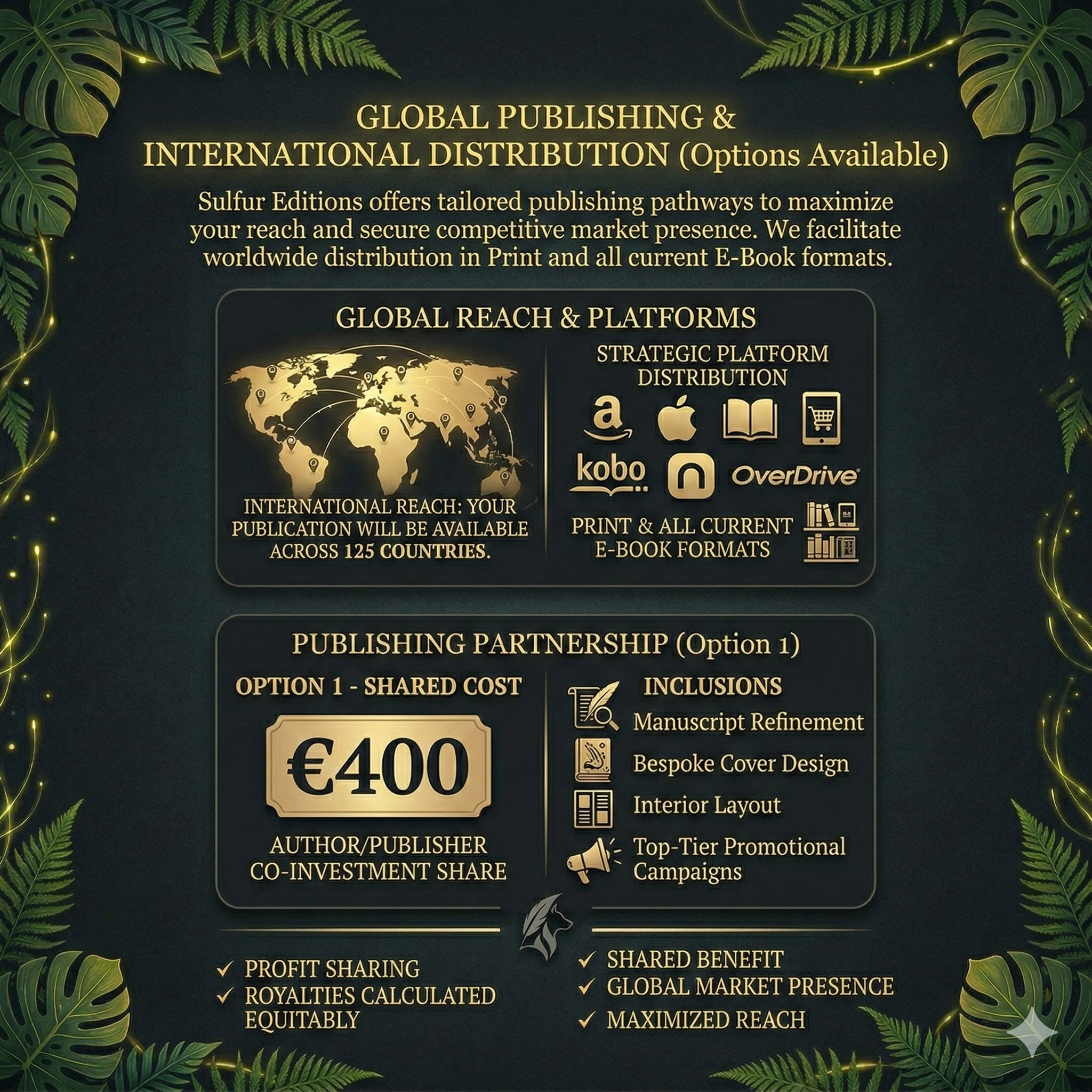 Publishing Partnership (Option 1 – Shared Cost): Co-investment: €400 (Author/Publisher share). Inclusions: Manuscript refinement, bespoke cover design, interior layout, and top-tier promotional campaigns.